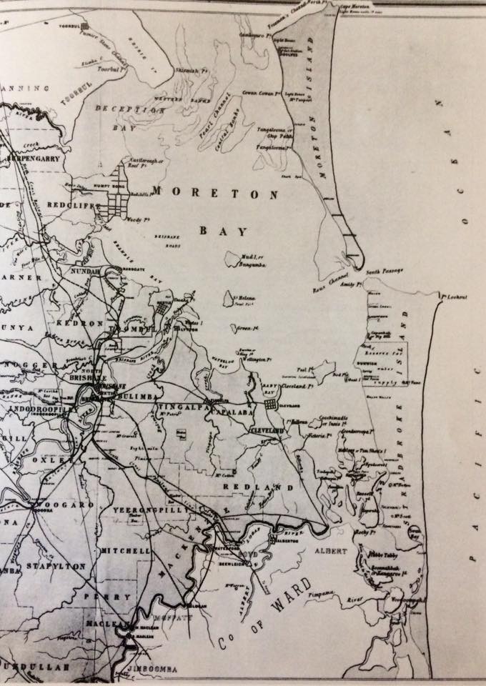 A map (1888) of part of the original Parish of Stanley is written to be one of the last maps to show Stradbroke as one land mass[2], preceding the break in the islands that occurred around 1896 which led to the creation of Jumpinpin Bar.